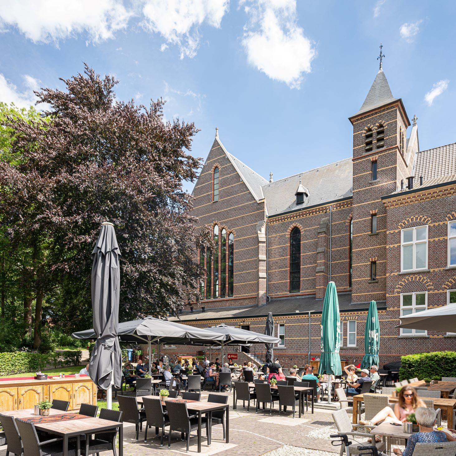 Achter de kerk ligt een prachtig, rustig terras. Het kijkt uit over het Absbroekbos en het natuurgebied Geleenbeekdal, waarin prachtige wandel- en fietsroutes lopen. Je bent daarom (ook binnen) met wandelschoenen en honden welkom.