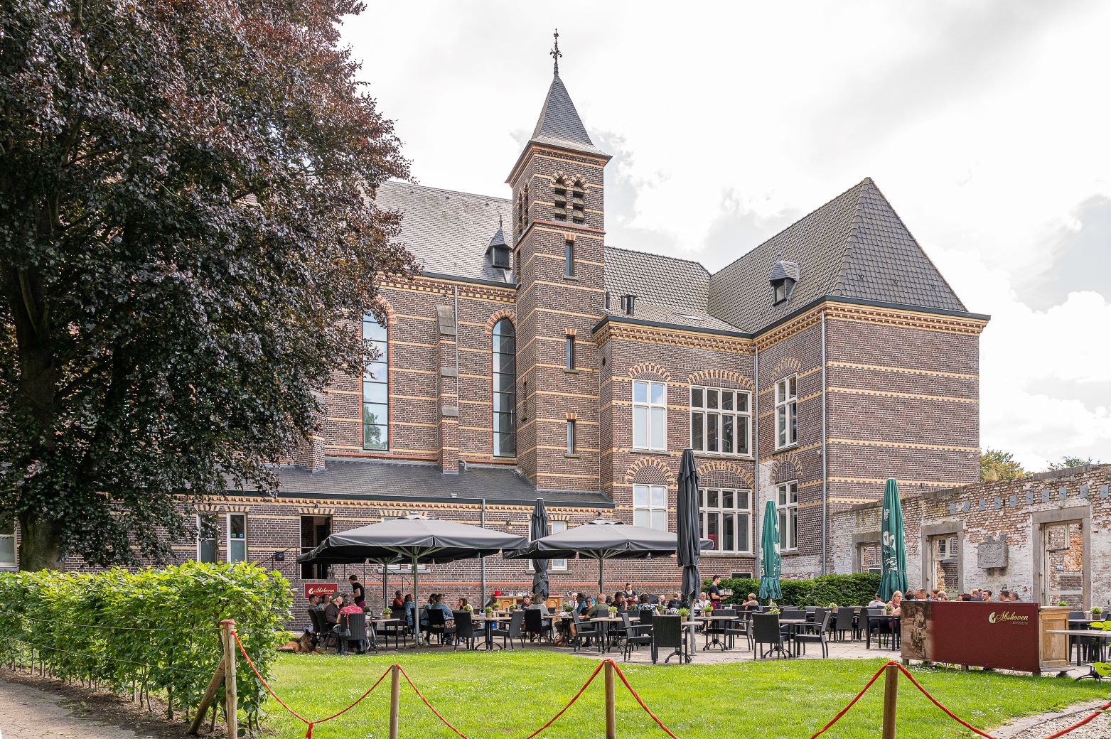 Parkeren kan gratis voor de deur. Het terras ligt beschut door het stukje ruïne dat de sloop van het voormalig klooster heeft overleefd.
